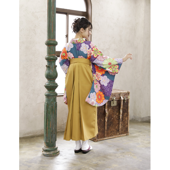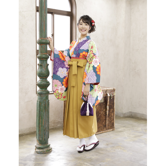 【色 / 柄】 着物:緑 袴:黄色 帯:赤